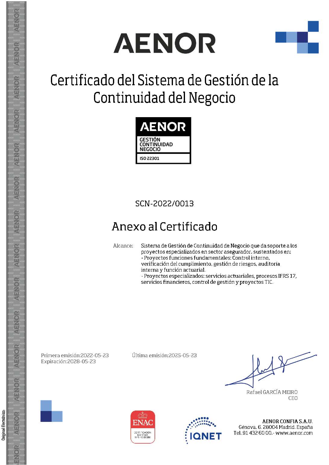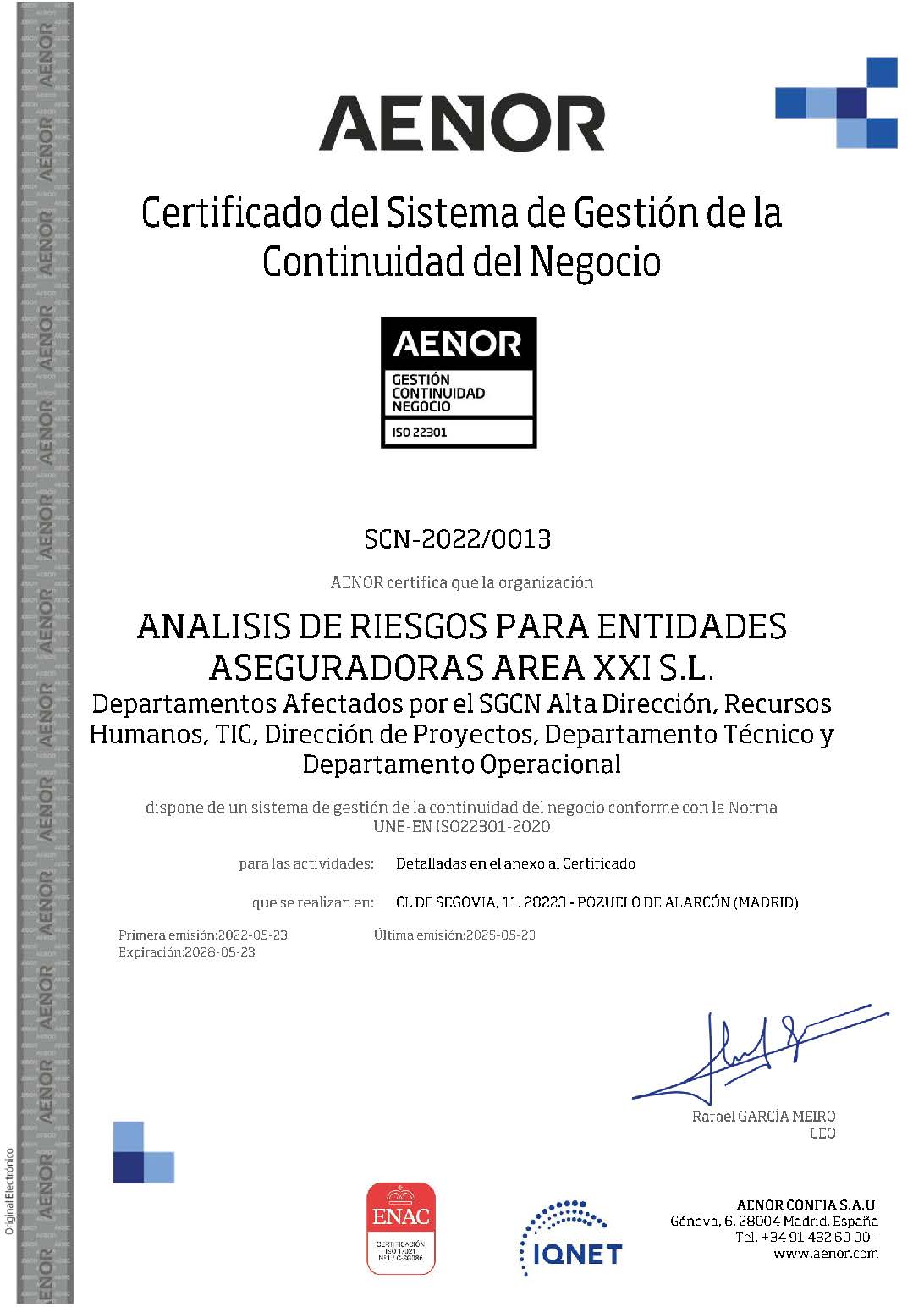 Por su parte, la certificación ISO 22301 conforme a la norma UNE-EN ISO 22301:2020 valida que AREA XXI mantiene un Sistema de Gestión de Continuidad de Negocio robusto y eficaz, garantizando su capacidad para responder ante posibles incidentes o situaciones de crisis, asegurando la resiliencia organizacional y la continuidad de sus operaciones críticas.