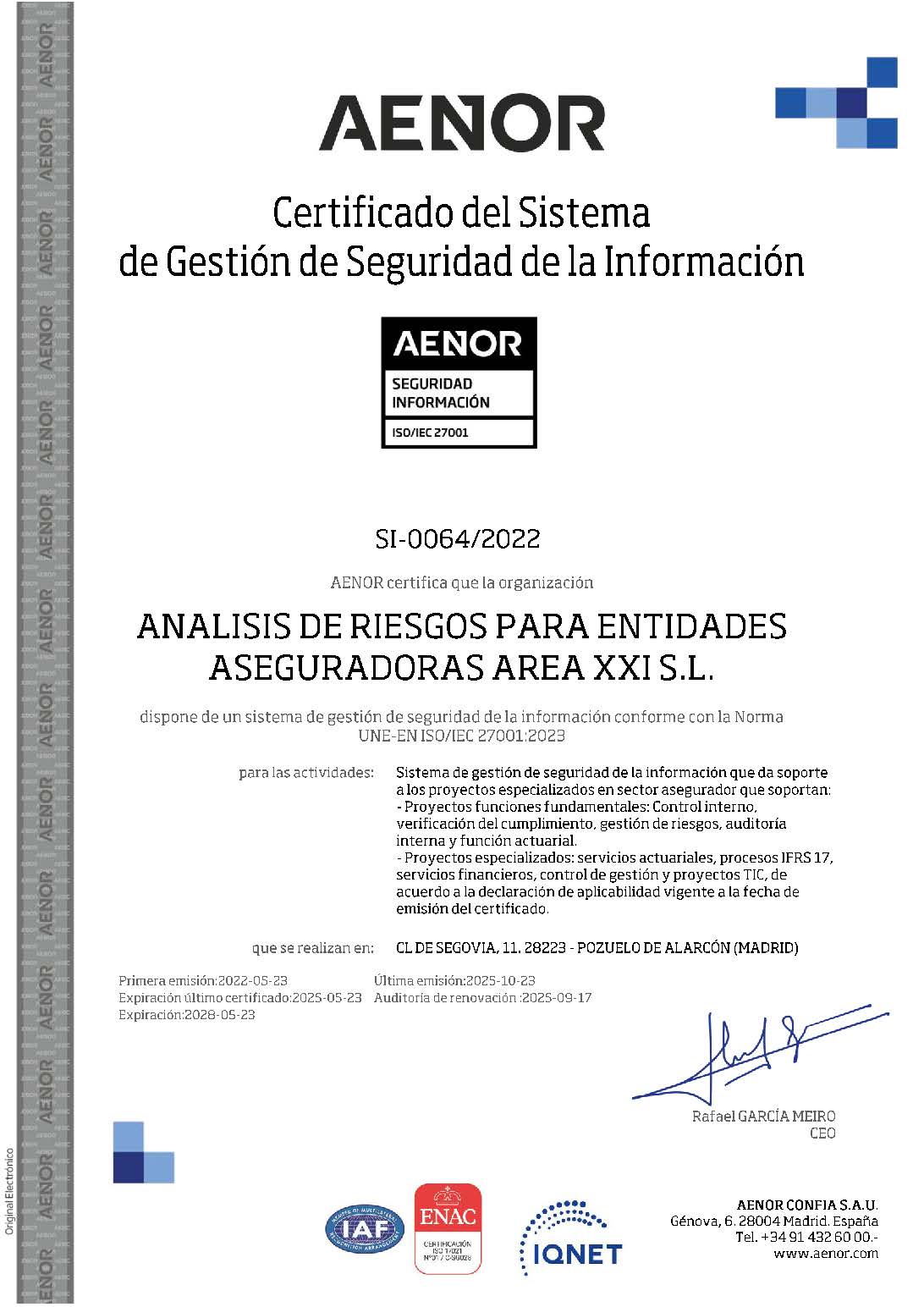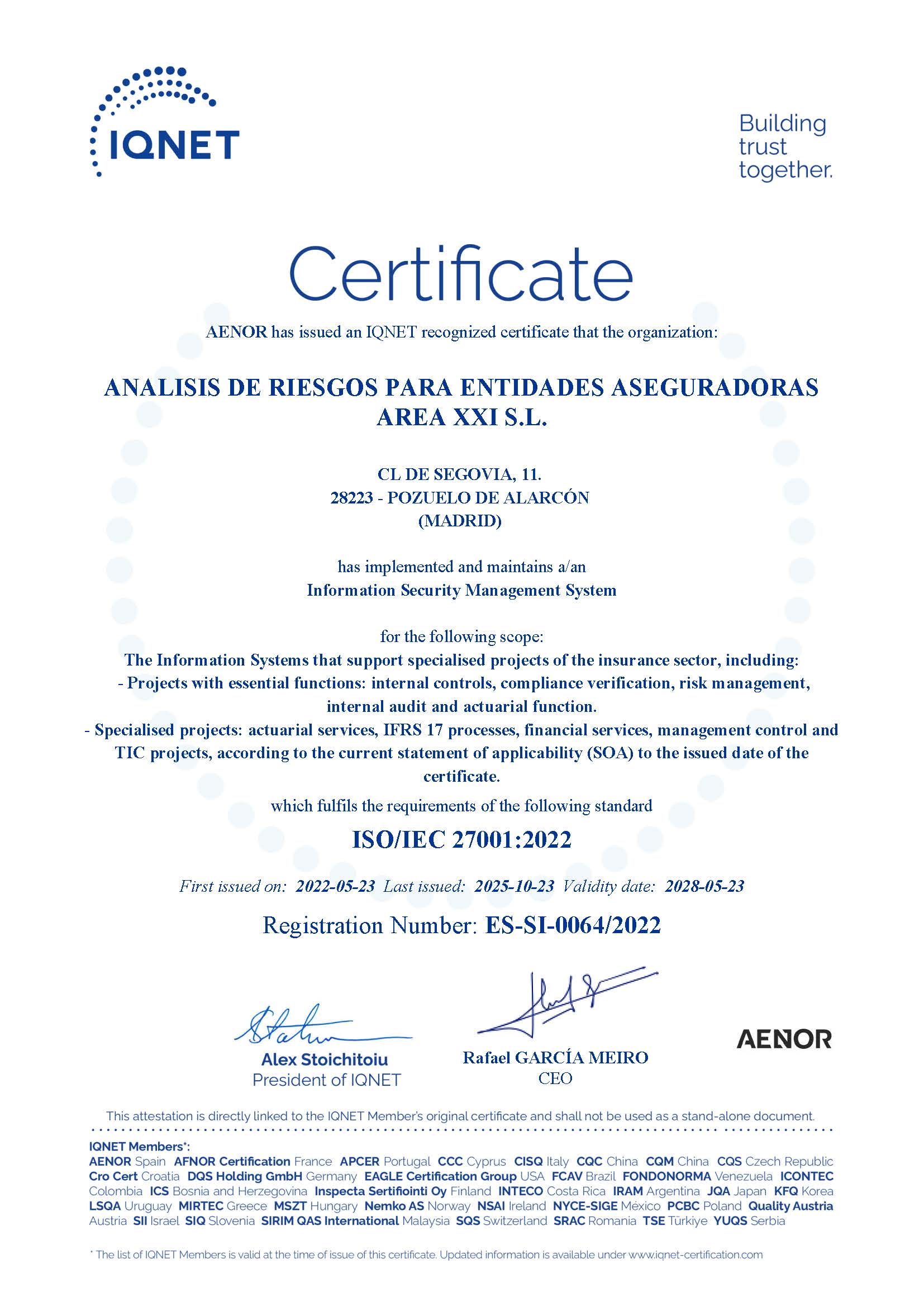La certificación ISO/IEC 27001 ha sido actualizada conforme a la nueva norma UNE-EN ISO/IEC 27001:2022, lo que demuestra la capacidad de AREA XXI para adaptarse a los estándares internacionales más recientes en materia de gestión de la seguridad de la información. Esta renovación amplía además el alcance del sistema de gestión, que da soporte a los proyectos especializados del sector asegurador, incluyendo funciones esenciales de control interno, verificación del cumplimiento, gestión de riesgos, auditoría interna y función actuarial, así como servicios actuariales, financieros, de control de gestión y proyectos TIC.
